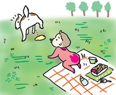 芝生でお弁当を広げるファミリーや寝っ転がって